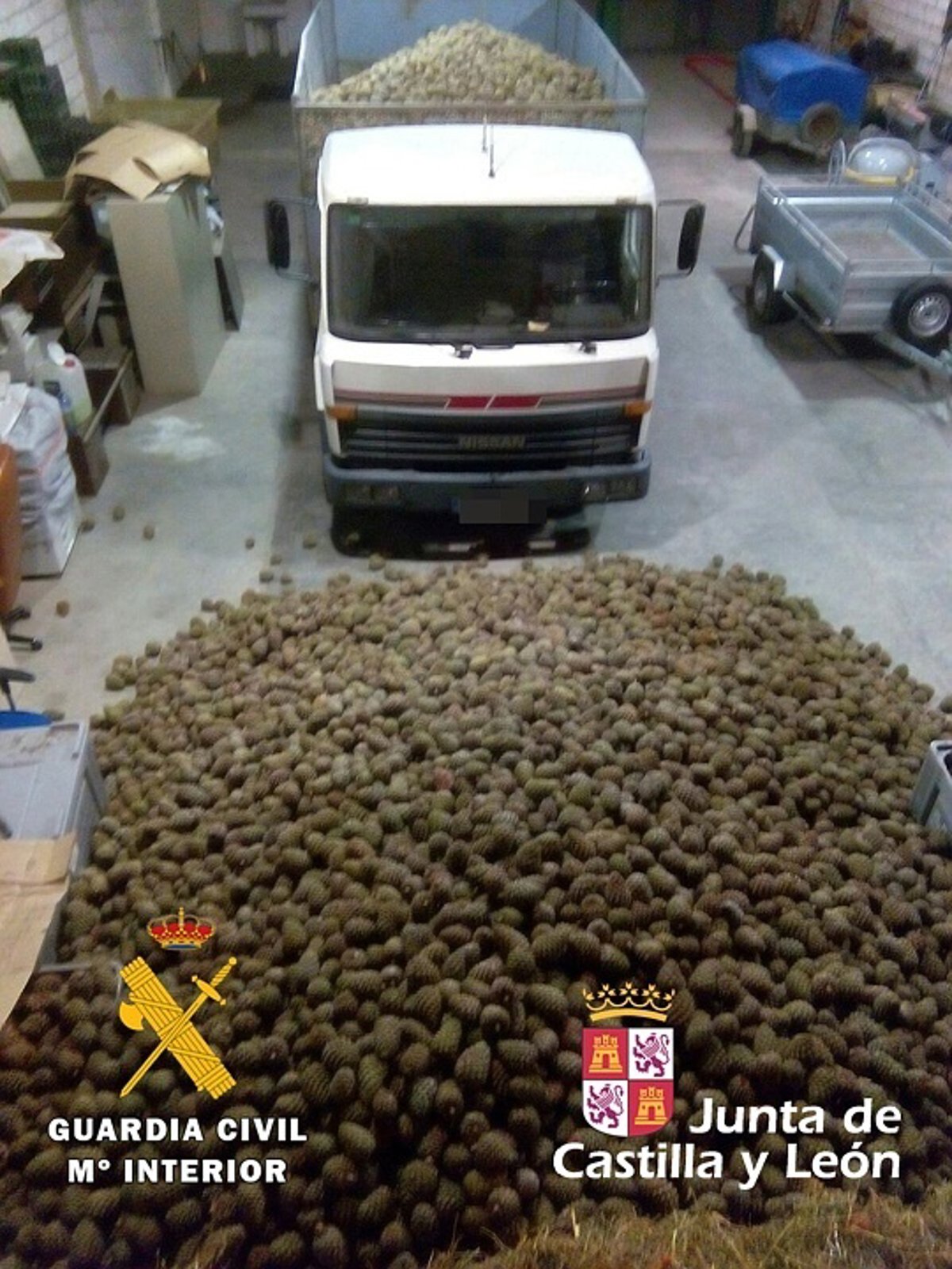 El Seprona de la Guardia Civil y agentes medioambientales de la Junta de Castilla y León han localizado e intervenido 14 toneladas de piñas de pino piñonero almacenadas ilegalmente en una nave del Alfoz de Burgos. Por ello, se han abierto expedientes sancionadores al responsable, de 45 años, por recolección de piñas fuera de época hábil y carecer de Licencia de Aprovechamiento.