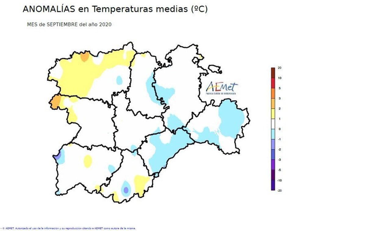Mapa elaborado por la Aemet sobre las anomalías de temperaturas en septiembre de 2020 - @AEMET_CYL