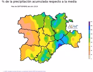 No obstante, el valor medio fue "muy similar" al valor normal para el mes de septiembre pero, como la mayor parte de las precipitaciones fueron en forma de chubasco y asociadas a tormentas, su distribución fue "muy heterogénea", según explica la Aemet en este informe.