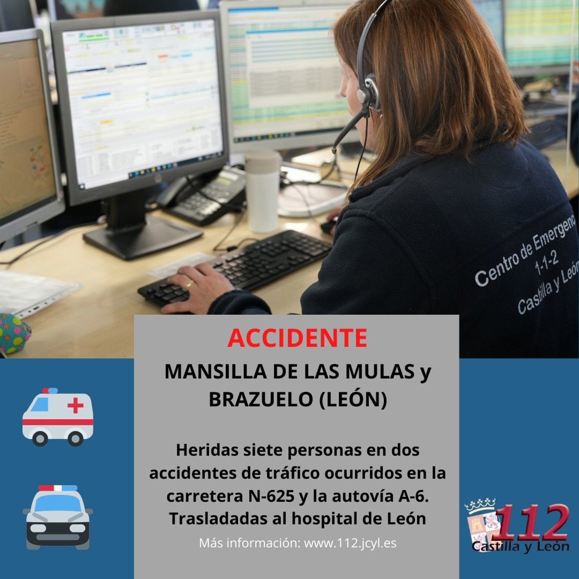 Siete personas han resultado heridas en sendos accidentes de tráfico en las localidades leonesas de Mansilla de las Mulas y Brazuelo, según datos del 112 Castilla y León recogidos por Europa Press.