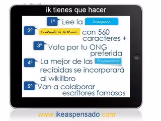 Asimismo, cada vez que un usuario manda una propuesta tiene que votar a una ONG de un listado de diez organizaciones --Amigos de Silva, Down España, Federación Española para la Lucha contra la Esclerosis Múltiple, Fundación Internacional El Arte de Vivir, Fundación Madrina, Fundación Theodora, Healing Wings, Médicos Sin Fronteras, Red Acoge y Tierra de Hombres-- y, una vez finalizado el wikilibro, saldrá a la venta en formato ebook en la plataforma online www.libros.com al precio de un euro.