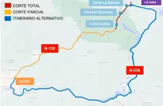 Además, se realizará un corte de tráfico en la N-120 kilómetro 454 en el que se avisará del corte total de la N-120 entre el kilómetro 440 y el kilómetro 436, dando paso a los vehículos que tenga como destino un punto intermedio entre el kilómetro 454 y el kilómetro 440. Del mismo modo, se procederá con los vehículos que circulan por la OU-622 kilómetro 1 sentido León.