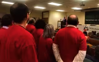 En concreto, Mañueco ha accedido a la tribuna del Salón de Actos de la Facultad de Comercio para clausurar la jornada y en ese momento varios representantes sindicales se han puesto en pie ataviados con una camiseta roja en la que se podía leer '35 horas ya' y así han permanecido durante los primeros minutos del discurso del presidente en este foro.
