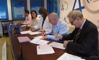 La presidenta de la CVE, Ángela de Miguel, el presidente de la asociación sectorial en Valladolid, José Luis González Corral, y los representantes sindicales de Comisiones Obreras Luis Sáez y Berta Fernández; y de UGT, Luis Ribera, han plasmado su firma en el acuerdo.