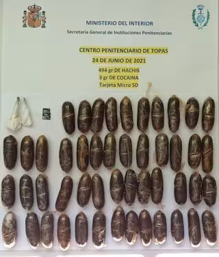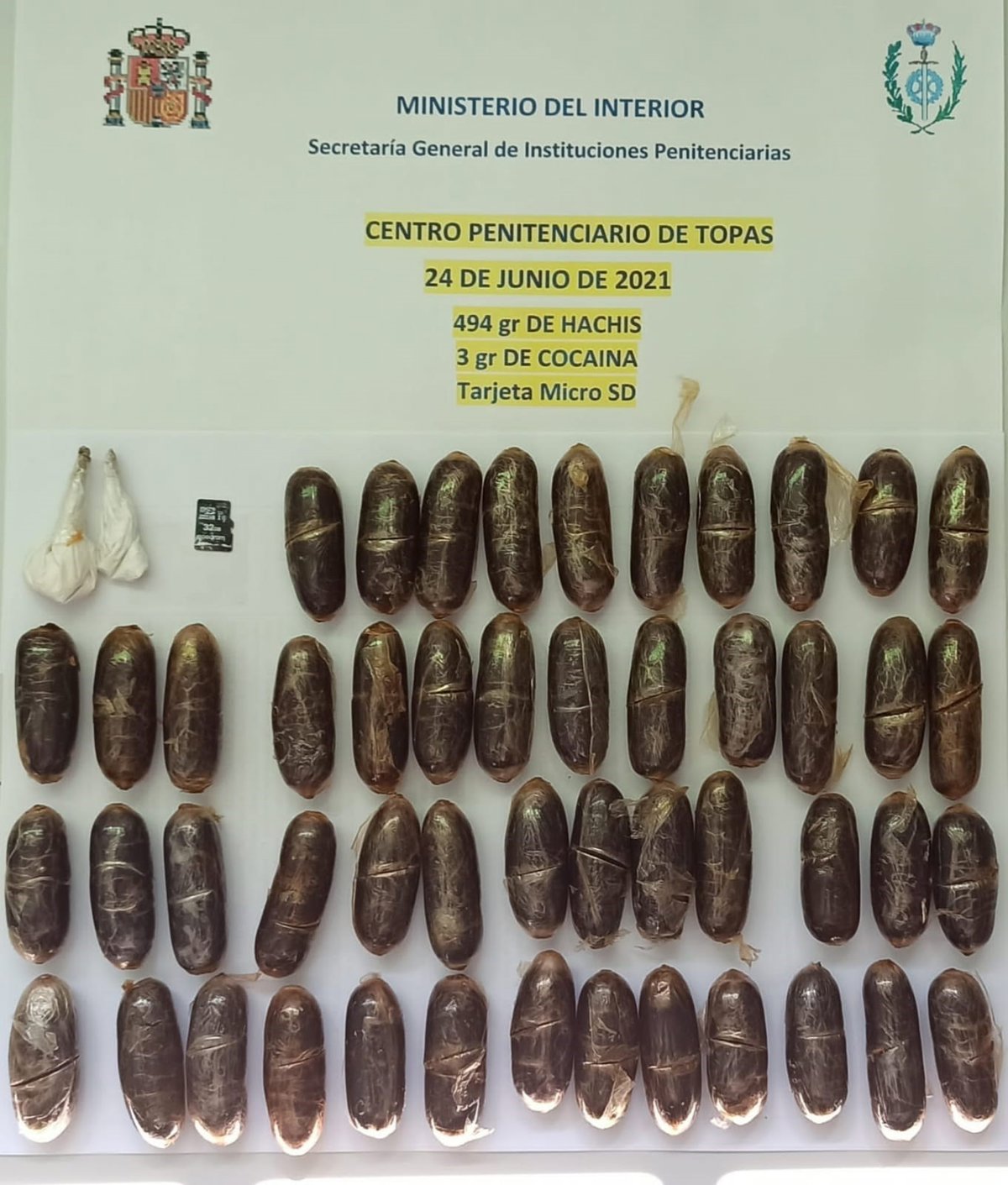 Funcionarios del Centro Penitenciario de Topas (Salamanca) han sorprendido a un interno, que regresaba a la cárcel después de un permiso, con medio kilo de hachís, tres gramos de cocaína y una tarjeta Micro SD, que llevaba dentro del cuerpo.