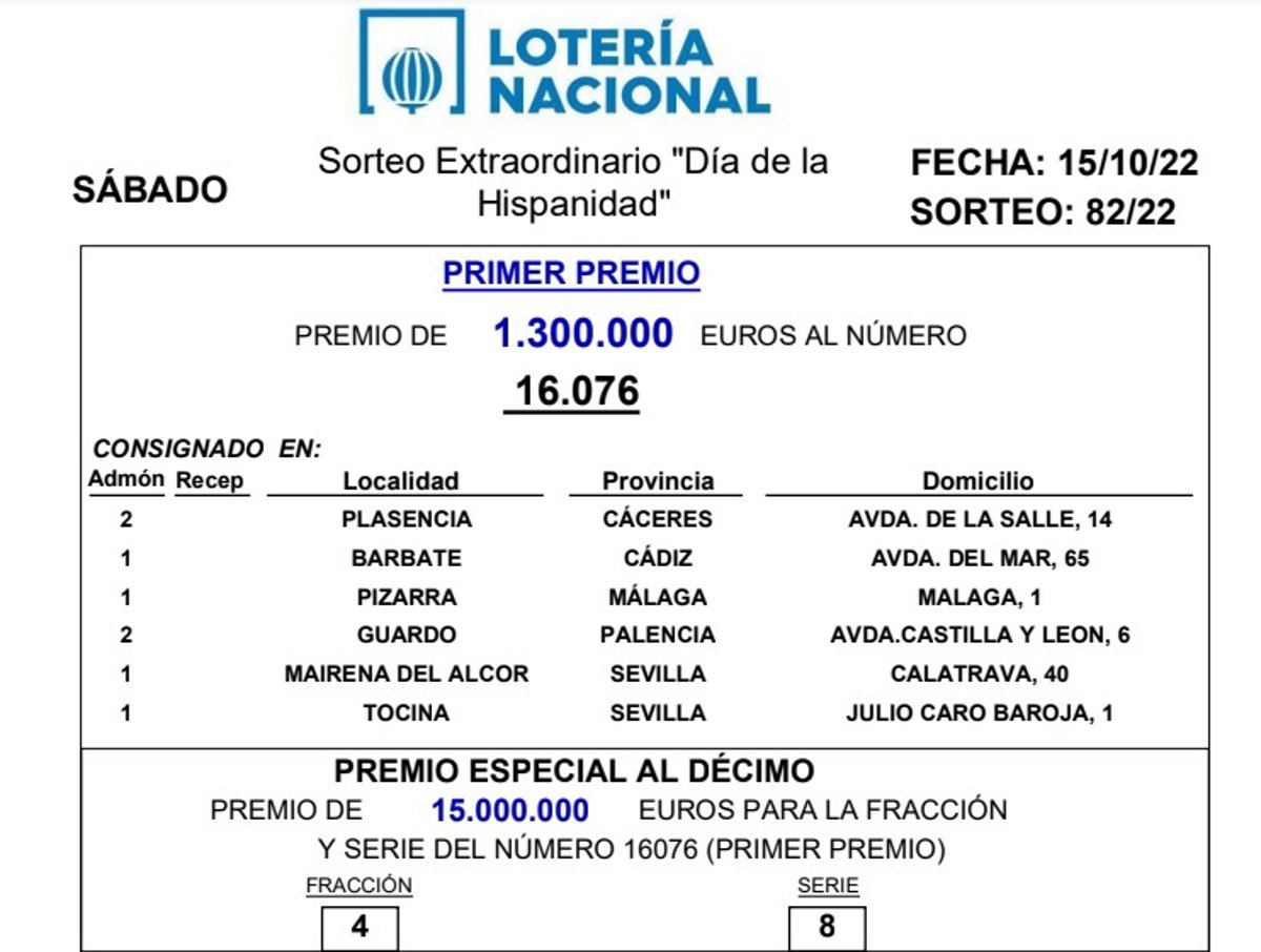 El premio especial al décimo, de 15 millones, por su parte, para la fracción y serie del número 16.076 (primer premio), ha sido para la fracción 4 y la serie 8.