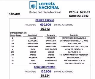 El sorteo de la Lotería Nacional ha dejado parte del primer premio, que ha recaído en el numero 66.912 y ha repartido 600.000 euros, en Palencia.