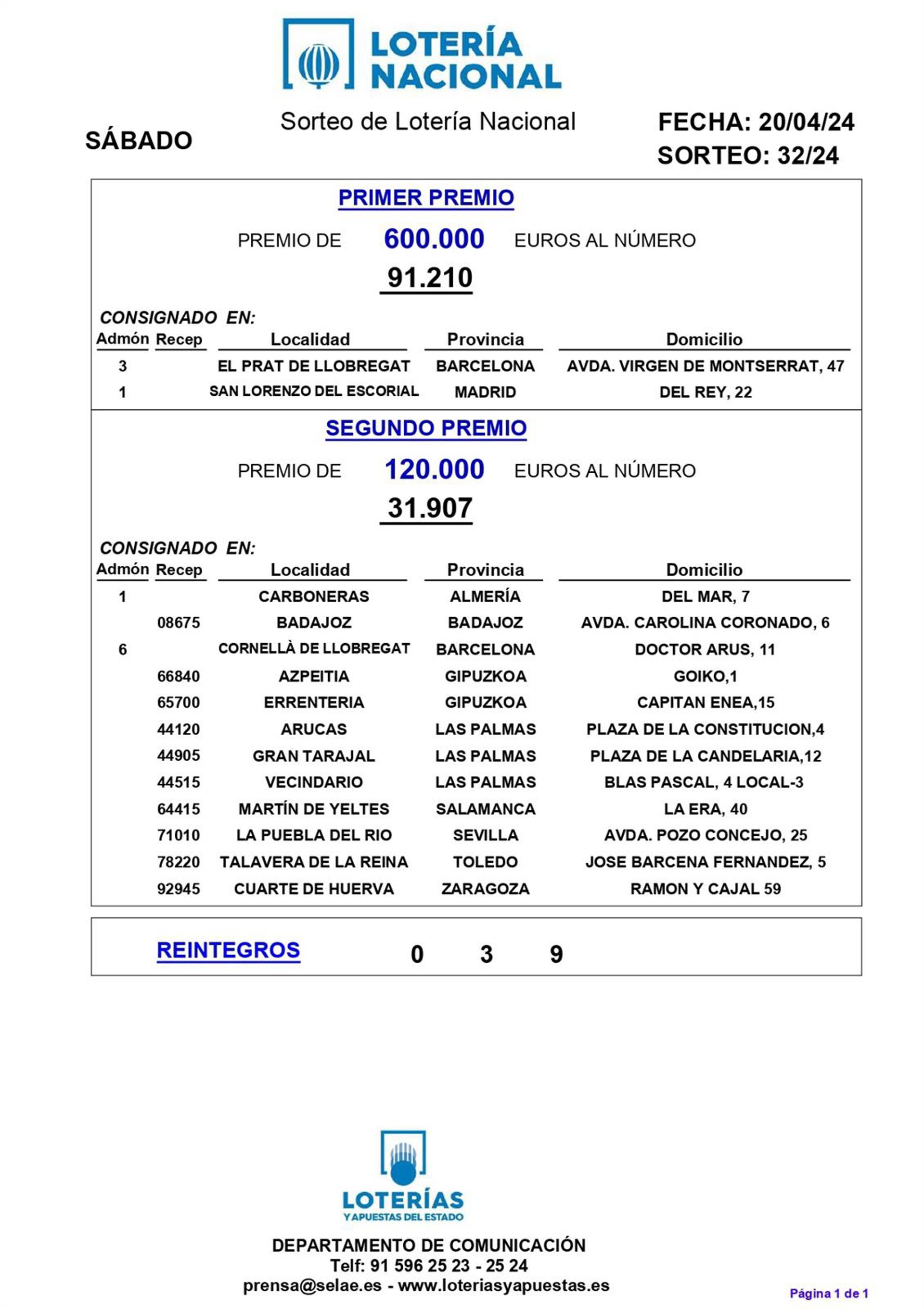 El primer premio ha recaído en el 91.210, mientras que el reintegro ha ido para los números 0, 3 y 9.