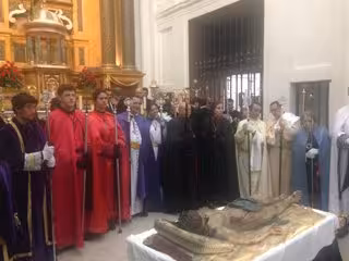 Tras la lectura de un pasaje del Evangelio y tres golpes de carraca, ha tenido lugar un breve acto de reflexión para proceder a la posterior entrega de la imagen del Yacente a las religiosas del Monasterio de San Joaquín y Santa Ana, a las que se hace entrega de la talla que, como es tradición, recibió la cofradía el Viernes de Dolores.