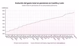 Gráfico de elaboración propia sobre la evolución del gasto de las pensiones en CyL en mayo de 2021 - EPDATA