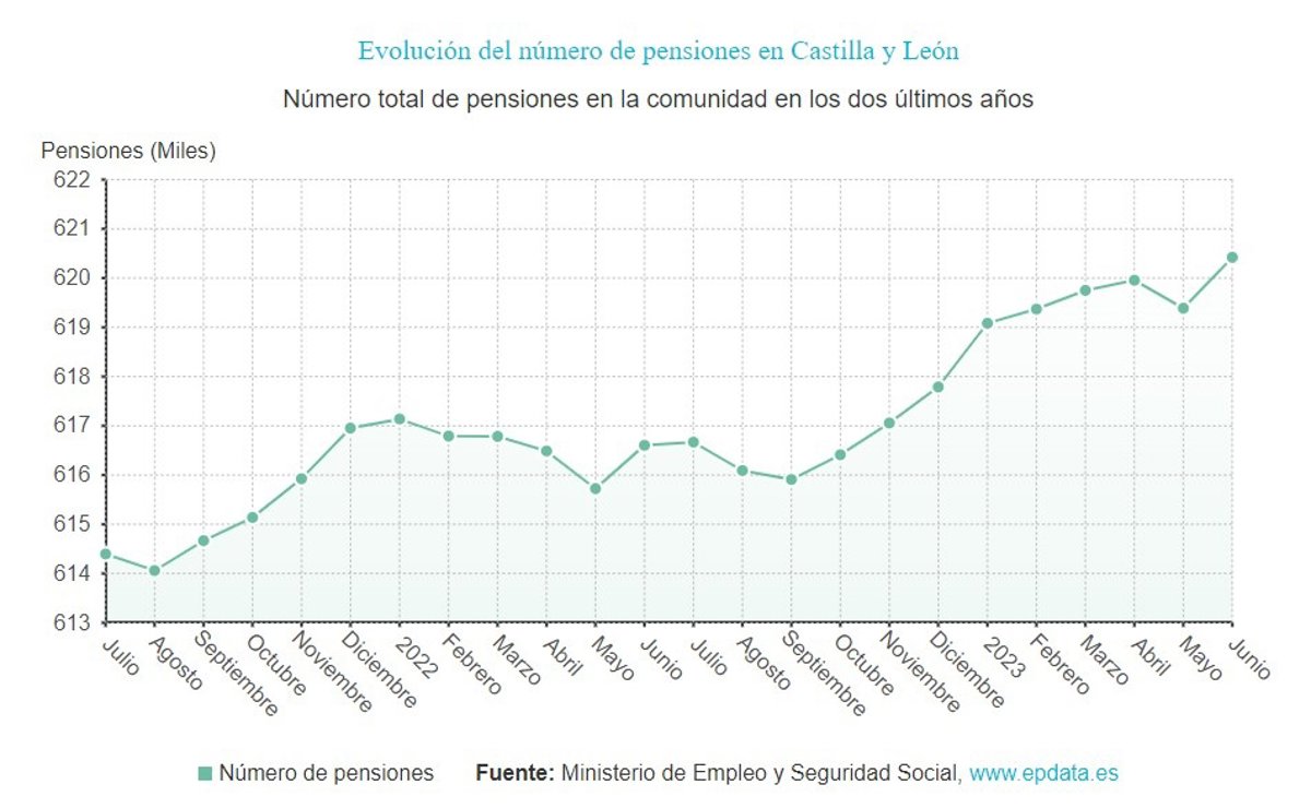 Gráfico de elaboración propia sobre la evolución de las pensiones en CyL hasta junio de 2023 - EPDATA