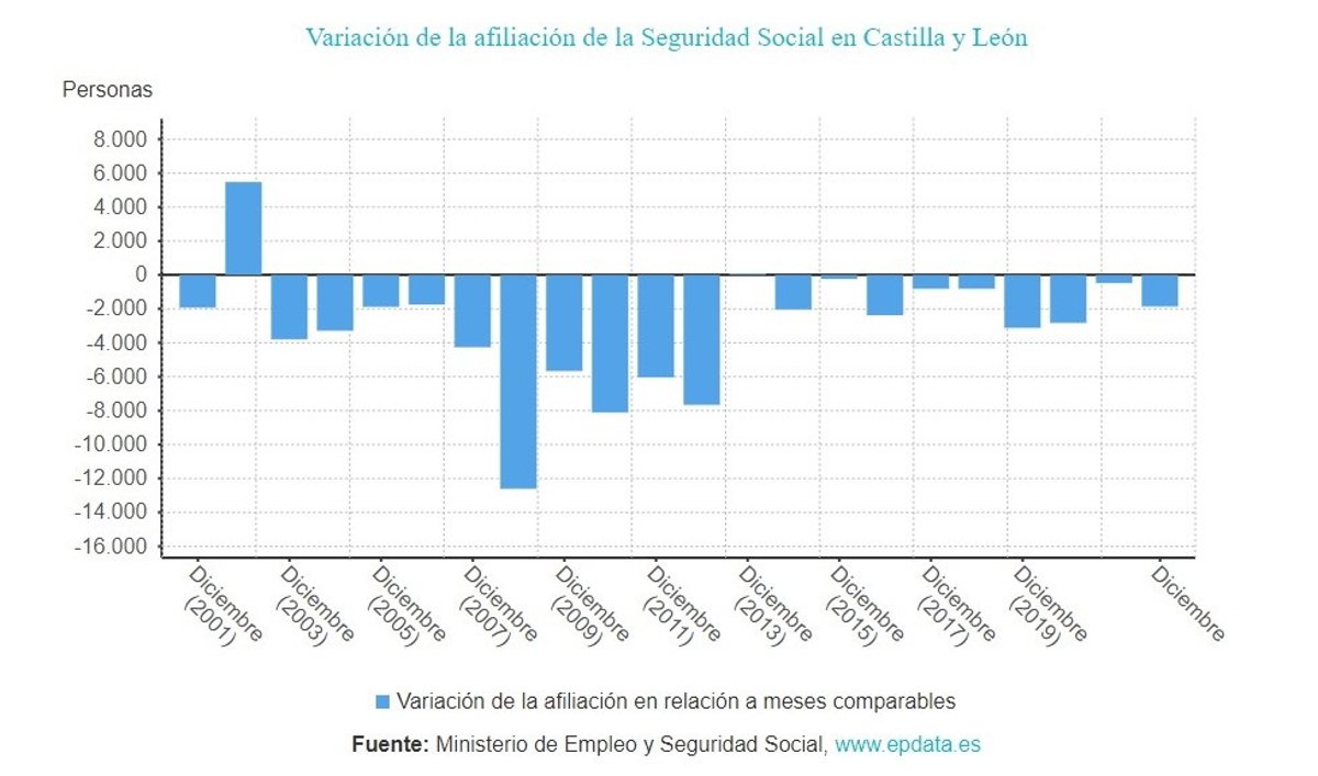 Pero si se compara la afiliación media de diciembre con la de noviembre número de afiliados a la Seguridad Social en Castilla y León cayó en 1.859 personas, lo que en términos relativos supuso un descenso del 0,20 por ciento, cuando la media nacional creció un leve 0,06 por ciento con 12.640 nuevos afiliados. Castilla y León registra el sexto mayor descenso.