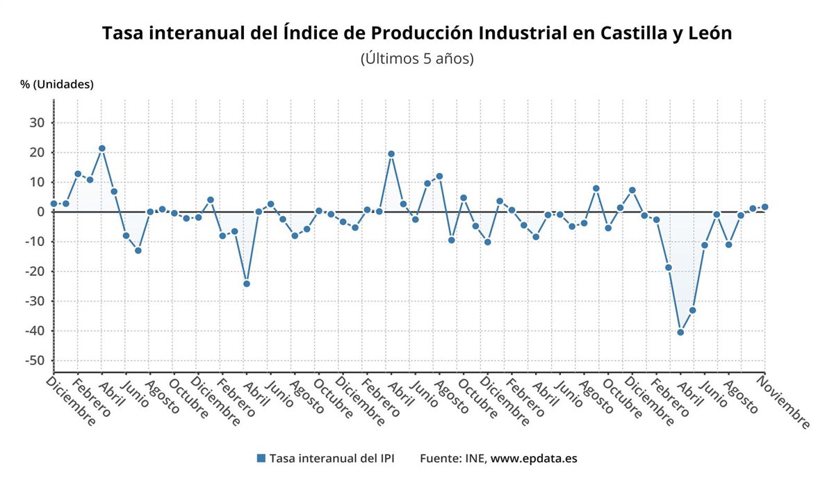El Índice General de Producción Industrial (IPI) aumentó un 1,7 por ciento en Castilla y León el pasado mes de noviembre en relación al mismo mes de 2019, frente a un -2,0 por ciento en el resto del país que modera en este caso en más de cuatro puntos el retroceso anual de octubre (-6,2 por ciento), según ha informado este lunes el Instituto Nacional de Estadística (INE).