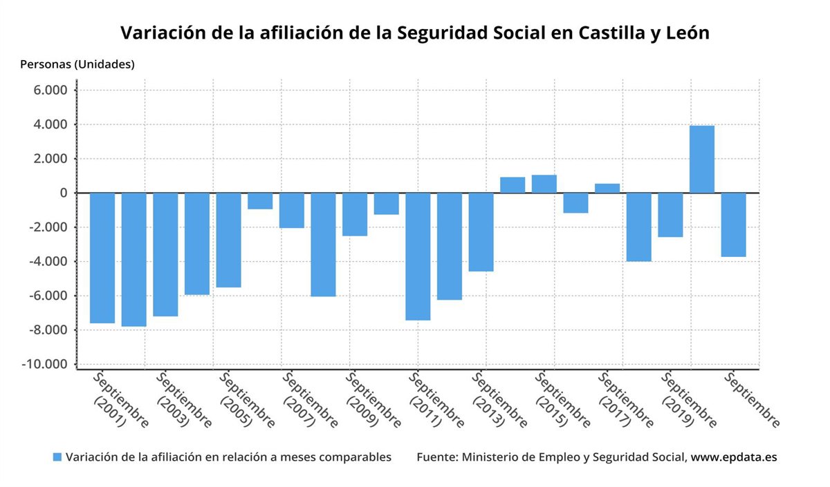 Sin embargo, si se compara la afiliación media de septiembre con la de agosto número de afiliados a la Seguridad Social en Castilla y León cayó en 3.730 personas, lo que en términos relativos supuso un descenso del 0,40 por ciento, cuando la media nacional aumenta un 0,29 por ciento (57.387 nuevos afiliados). La afiliación aumentó en ocho comunidades autónomas y bajó el resto.