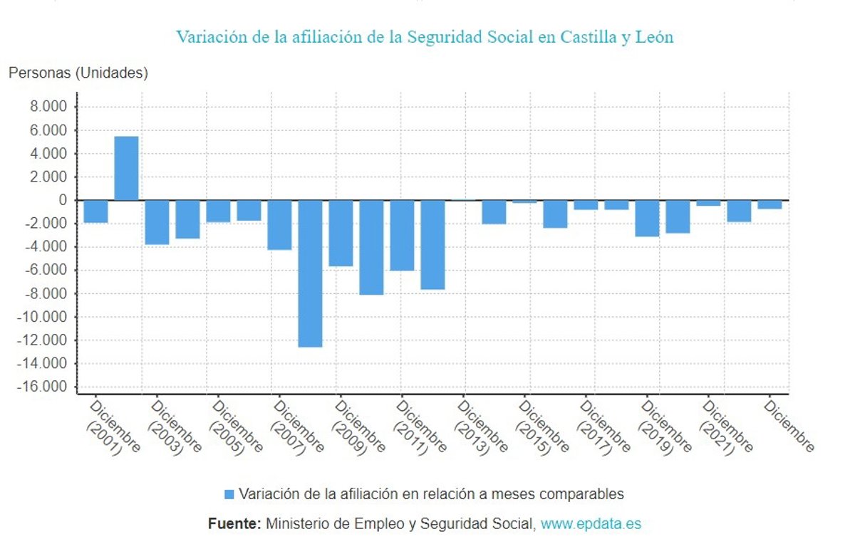 Y si se compara la afiliación media de diciembre con la de noviembre el número de afiliados a la Seguridad Social en Castilla y León cayó en 744 personas, lo que en términos relativos supuso un ligero descenso del 0,08 por ciento, cuando la media del país subió un ligero 0,14 por ciento con 29.937 afiliados más en este caso.