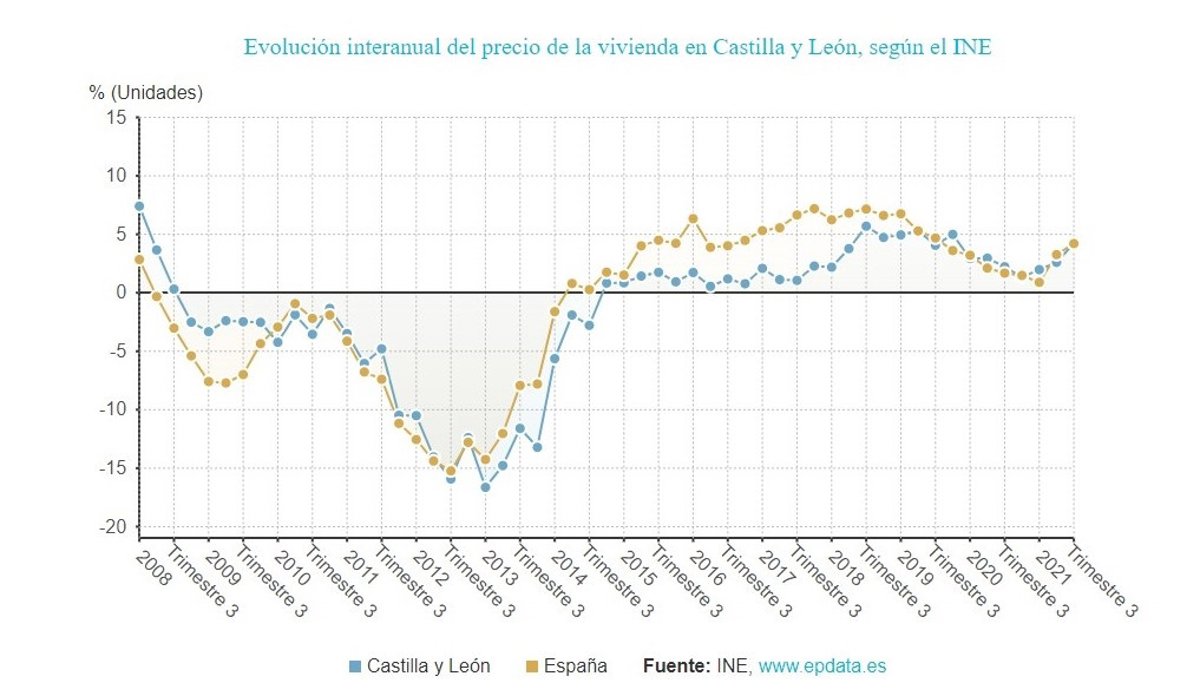 El precio de la vivienda libre en Castilla y León subió un 4,2 por ciento en el tercer trimestre en tasa interanual, al igual que en España que anota en este caso una tasa nueve décimas superior a la del trimestre anterior y la más elevada desde el tercer trimestre de 2019, antes de la llegada de la pandemia, según el Índice de Precios de Vivienda (IPV) del Instituto Nacional de Estadística (INE) publicado este viernes.