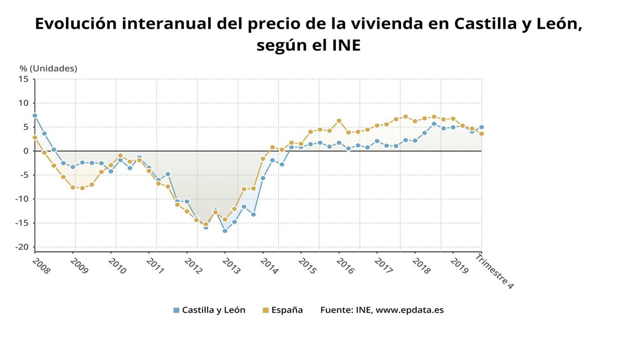 El precio de la vivienda libre en Castilla y León subió un 5,0 por ciento en el cuarto trimestre de 2019 respecto al mismo periodo del año anterior, por encima de la media nacional que aumentó un 3,6 por ciento y registra en este caso su sexto repunte anual consecutivo aunque el menos pronunciado desde 2015, según el Índice de Precios de Vivienda (IPV) del Instituto Nacional de Estadística (INE) publicado este martes y recogido por Europa Press.