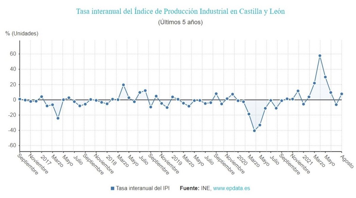 El Índice General de Producción Industrial (IPI) en Castilla y León repuntó un 7,7 por ciento en agosto en relación al mismo mes de 2020, superior a la media nacional que aumentó un 3,6 por ciento y amplió en más de tres puntos el avance interanual registrado en julio, que fue del 0,4 por ciento.