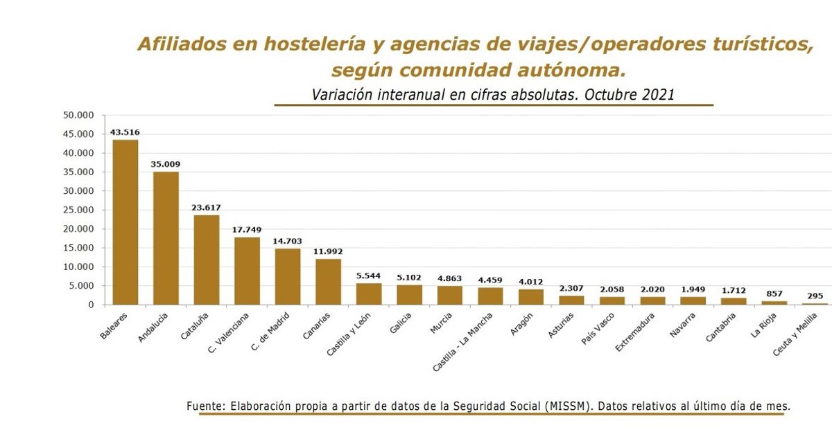 Gráfico facilitado por Turespaña sobre la afiliación en el sector turístico por CCAA en octubre - TURESPAÑA