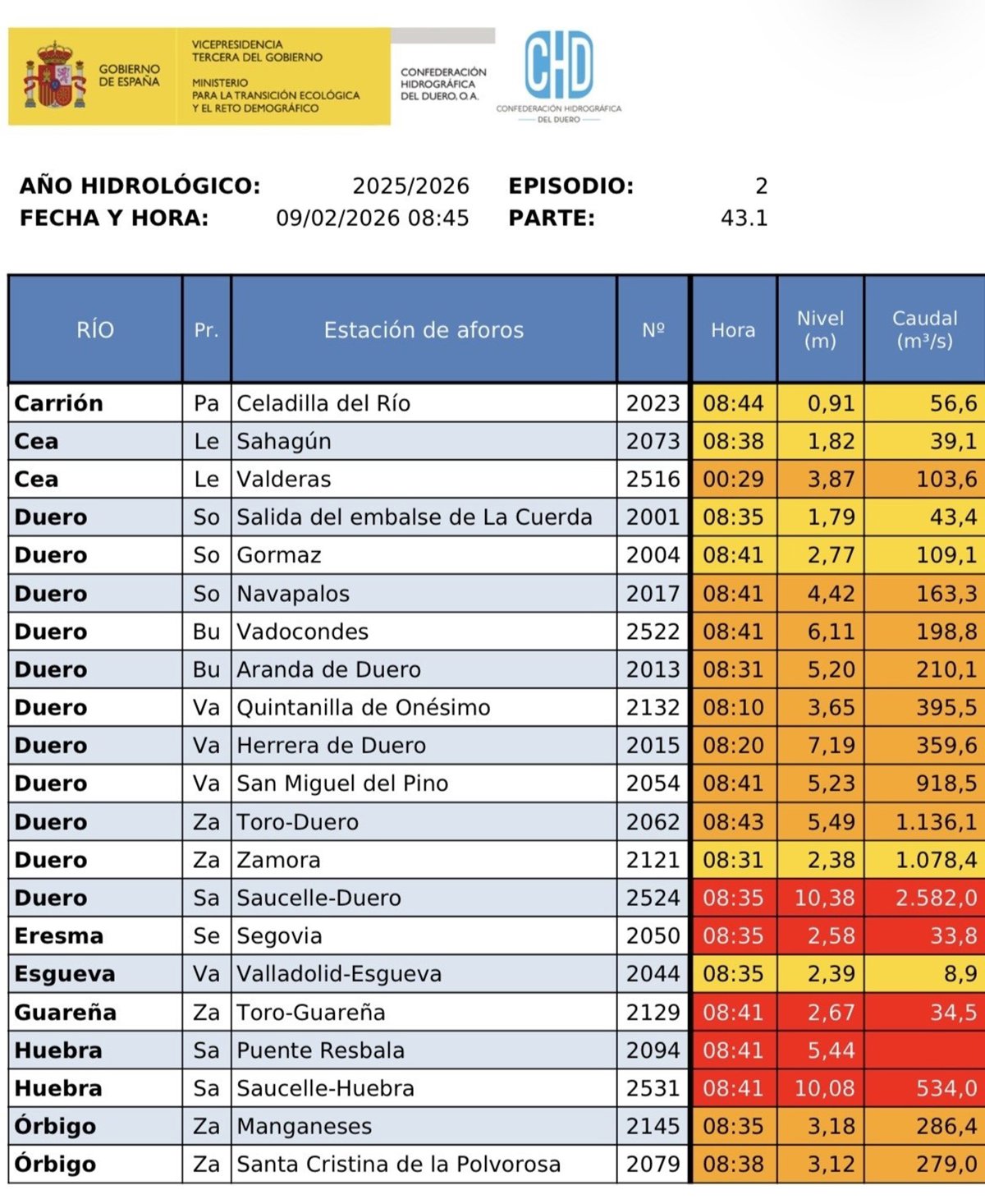 El principal río con estaciones con avisos naranja es el Duero con siete estaciones en este nivel: en Quintanilla de Onésimo, Herrera de Duero y San Miguel del Pino, en la provincia de Valladolid; Vadocondes y Aranda de Duero, a su paso por la provincia de Burgos; Navapalos (Soria), y Toro, en Zamora: