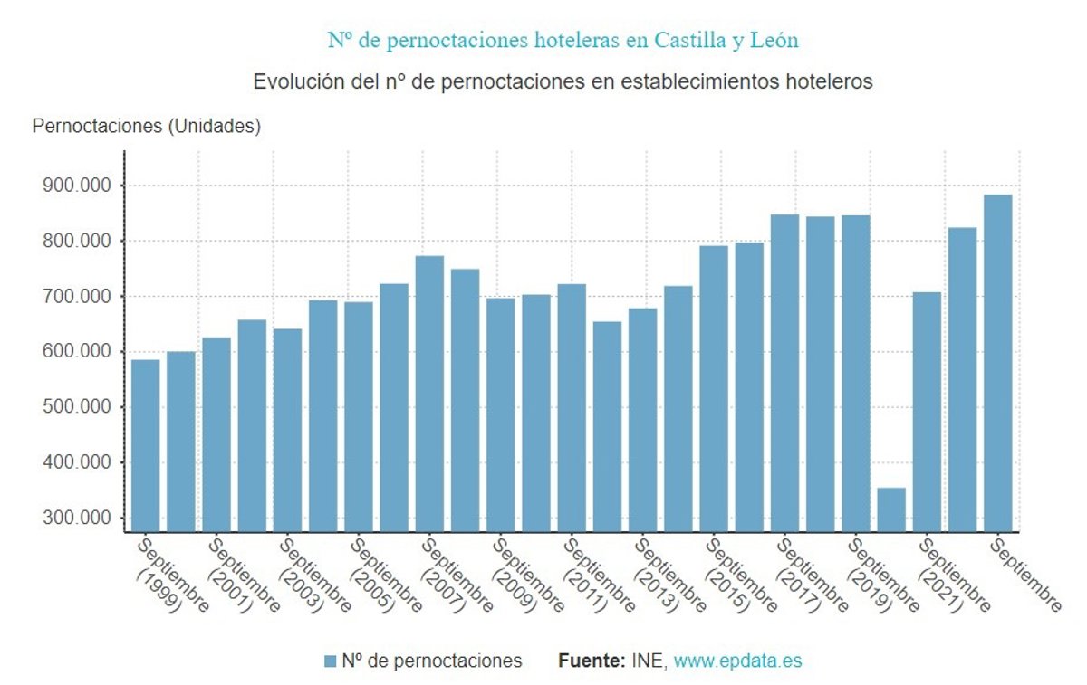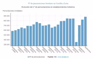 Gráfico de elaboración propia sobre la evolución de las pernoctaciones hoteleras en CyL hasta septiembre - EPDATA