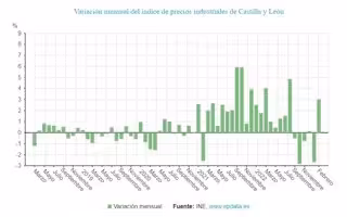 La tasa anual del IPRI ha aumentado en febrero en diez comunidades autónomas, entre ellas Castilla y León, y disminuido en las siete restantes. Los mayores incrementos se producen en Canarias, Illes Balears y Principado de Asturias, cuyas tasas suben 10,5, 9,3 y 8,7 puntos, respectivamente, y los mayores descensos se ha anotado en País Vasco, Cantabria y Región de Murcia, con bajadas de 4,7, 4,4 y 1,8 puntos, respectivamente.