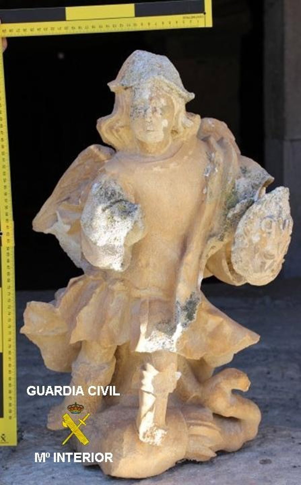 La Guardia Civil ha recuperado, gracias a la colaboración ciudadana, una talla en piedra de San Miguel, del siglo XVII, sustraída momentos antes de la fachada de la ermita Virgen de la Cueva, en Hontangas, y abandonada por los expoliadores en la huída.