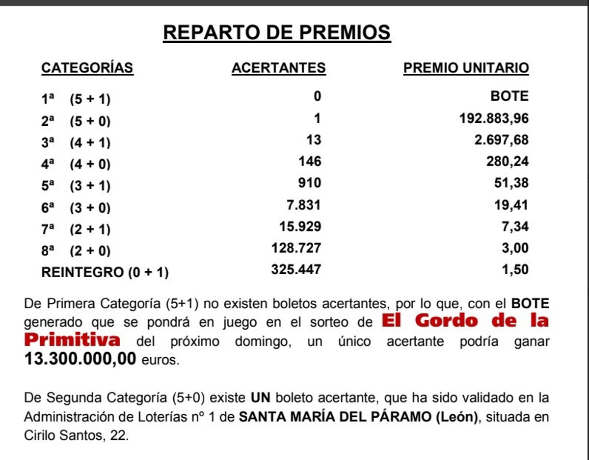 El sorteo del Gordo de la Primitiva de este domingo, 23 de febrero, ha dejado 192.883,96 euros en un premio de segunda categoría (cinco aciertos) en la localidad leonesa de Santa María del Páramo, según informan fuentes de Loterías y Apuestas del Estado a Europa Press.
