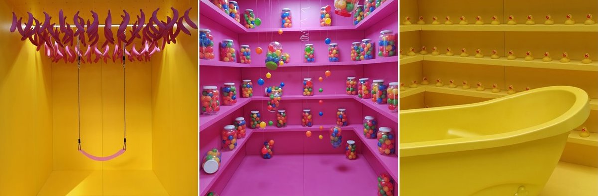A través de un camino de estrellas los visitantes se adentrarán para descubrir cada uno de los mágicos espacios que les esperan y hacer volar la imaginación: bolas de colores que quedan suspendidas en el aire; una sorprendente lluvia de donuts de diferentes dimensiones; una relajante bañera a todo color rodeada de patitos; la ilusión de columpiarse bajo un cielo cubierto de plátanos rosas; cabalgar sobre un unicornio a tamaño natural con el arcoíris en el horizonte y una tarrina de helado gigante con la que poder fotografiarse.