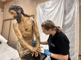 Una de las profesionales del Centro de Restauración y Conservación de la Fundación de las Edades del Hombre realiza labores de limpieza en 'El Señor Atado a la Columna'. - EUROPA PRESS