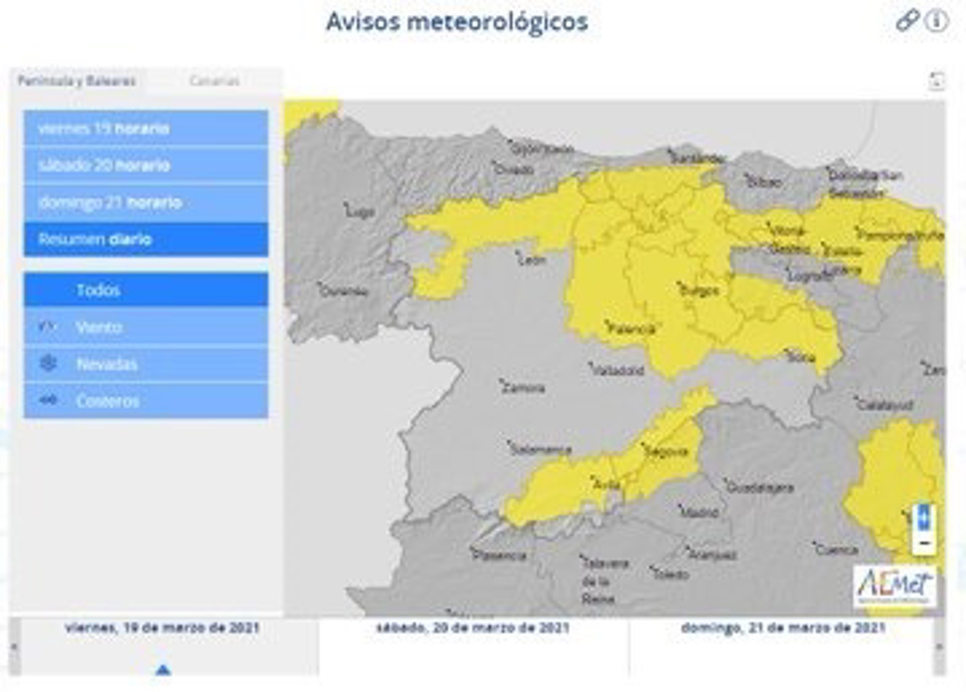 A esto se unen precipitaciones en forma de nevadas este mismo viernes en zonas altas y de montaña y en las ciudades de Burgos, Soria y Segovia donde se prevén en concreto nevadas de carácter "débil". Finalmente, la Aemet advierte de peligro notable de aludes en Picos de Europa.