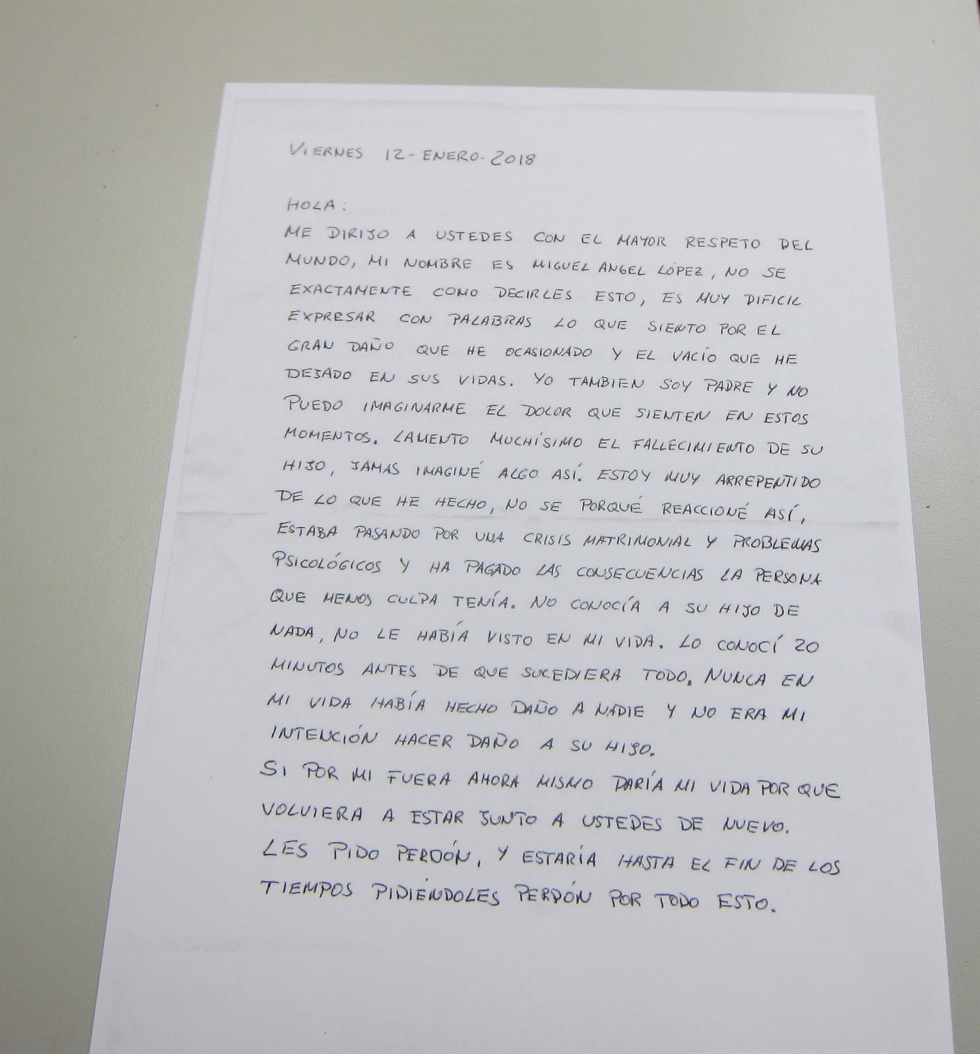 "Yo también soy padre y no puedo imaginarme el dolor que sienten en estos momentos. Lamento muchísimo el fallecimiento de su hijo, jamás imaginé algo así. Estoy muy arrepentido de lo que he hecho, no sé por qué reaccioné así, estaba pasando por una crisis matrimonial y problemas psicológicos y ha pagado las consecuencias la persona que menos culpa tenía", apunta el confeso autor del crimen, quien también asegura que no conocía al fallecido y que no le había visto jamás hasta el día de autos.