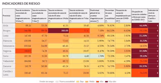 En Burgos los indicadores se encuentran más alejados de los límites, ya que incluso la incidencia a 14 días entre mayores de 65 se sitúa en riesgo 'muy alto', con 167 casos por 100.000, mientras que los otros tres figuran en riesgo 'alto'.