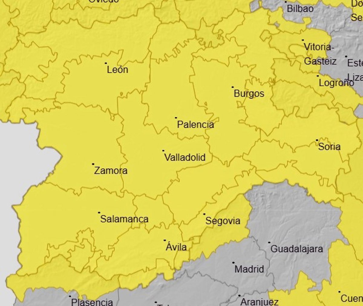 En concreto, las nueve provincias estarán en aviso amarillo entre las 12.00 y las 0.00 horas por vientos que podrían alcanzar rachas máximas de 90 kilómetros por hora en la Cordillera Cantábrica de León y la zona de Sanabria en Zamora, hasta 80 en el Sistema Central de Ávila, Salamanca, Segovia y Soria, la Cordillera Cantábrica en Burgos y Palencia, la Ibérica en las provincias burgalesas y soriana y El Bierzo (León). En el resto el aviso se rebaja a velocidades máximas del viento de 70 kilómetros por hora y, en el caso de Condado Treviño (Burgos) entrará en vigor algo más tarde que en el resto, a las 18.00 horas.