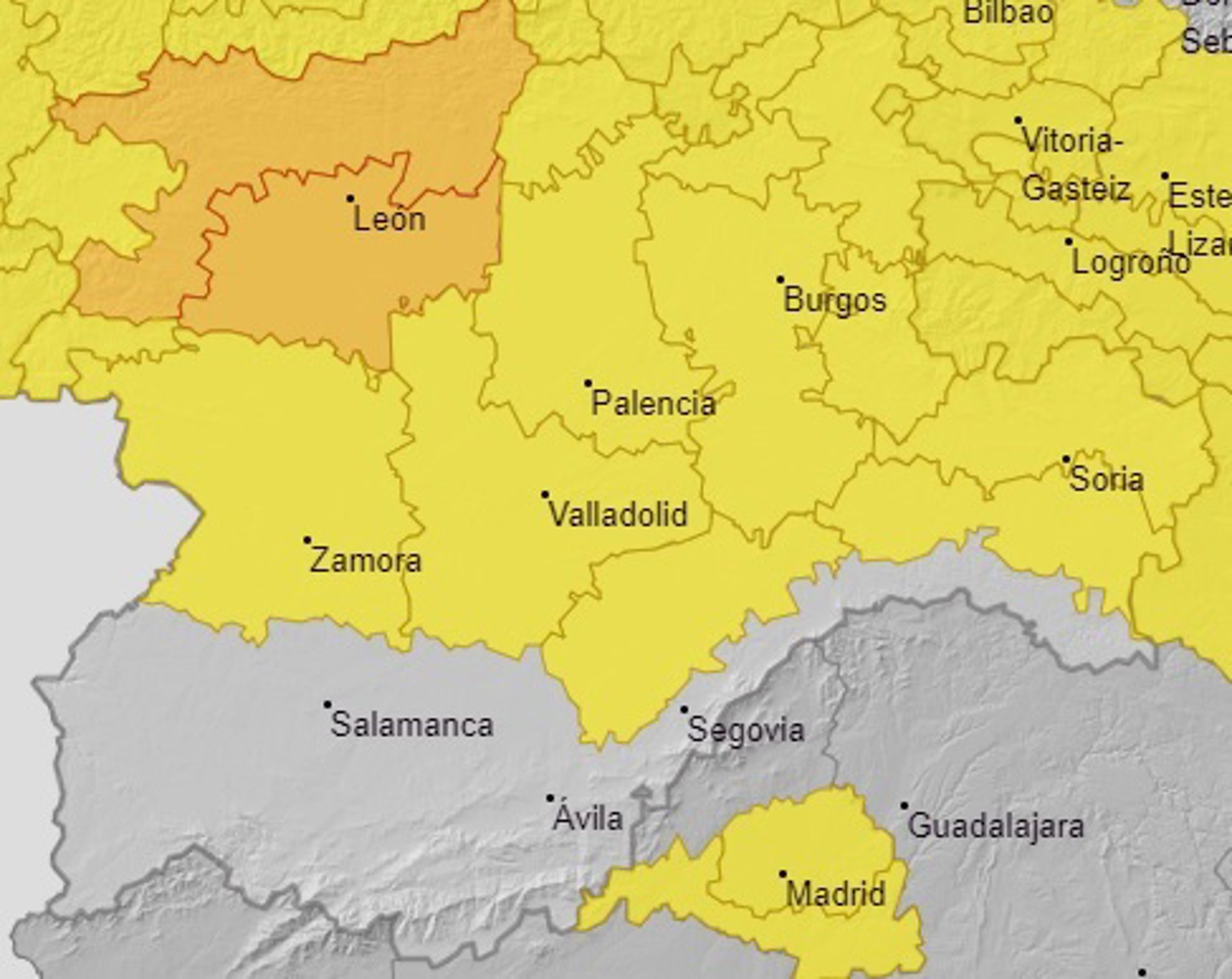 En riesgo --nivel amarillo-- se encuentran por tormentas la zona de El Bierzo, en la provincia de León (entre las 11.00 y todo el día); todo el territorio de las provincias de Burgos, Palencia, Soria, Valladolid y Zamora (entre las 11.00 y las 23.00 horas) y la Meseta de Segovia (entre las 11.00 y las 20.00).