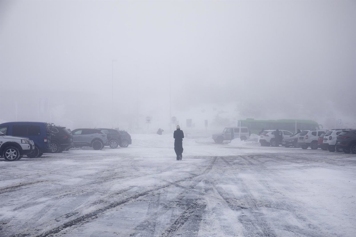 Una persona camina por la nieve en el parking del Puerto de Navacerrada, a 19 de enero de 2023, en Navacerrada, Madrid (España). La Agencia de Seguridad y Emergencias de la Comunidad de Madrid (ASEM 112) ha activado la situación 0 de la fase de alerta d - Rafael Bastante - Europa Press