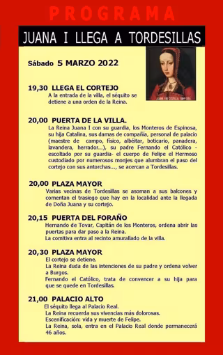 El público que se acerque al municipio podrá ver en la Plaza Mayor a varias vecinas asomándose a sus balcones para comentar el bullicio ante la llegada de Doña Juana y su cortejo. Será minutos después, en la Puerta del Foraño (20.15 horas), donde Hernando de Tovar, capitán de los Monteros, ordene abrir las puertas para dar paso a la comitiva, que entra en la localidad amurallada. De nuevo en la Plaza Mayor (20.30 horas), Fernando el Católico intentará convencer a su hija para que se quede en Tordesillas.