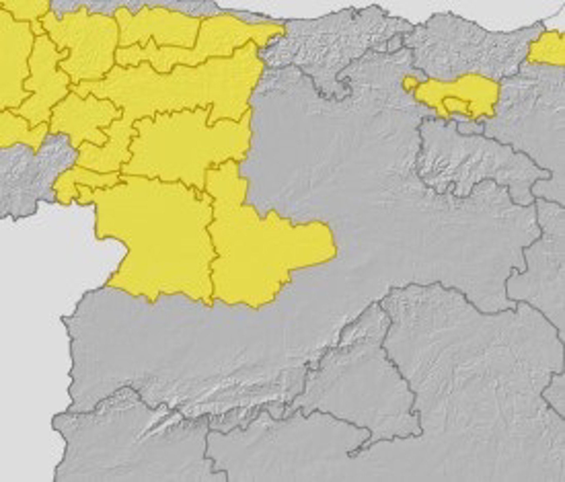 Según datos de la Agencia Española de Meteorología (Aemet), estos tres avisos se suman al que ya se había activado para el Condado de Treviño, en la provincia de Burgos, donde el riesgo se limita a vientos por rachas de hasta 70 kilómetros por hora.