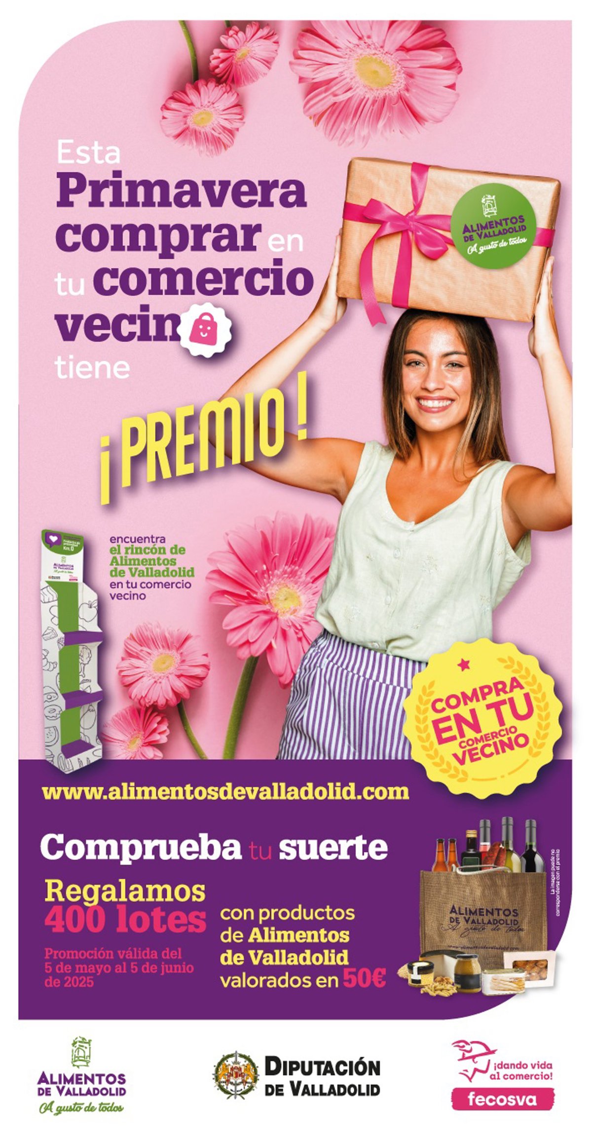 La Diputación Provincial y la Federación de Comercio y Servicios de Valladolid Fecosva, ponen en marcha la nueva campaña 'Esta Primavera, comprar en tu comercio vecino tiene premio' en la que un total de 50 establecimientos de 23 municipios de la provincia sortearán entre sus clientes 400 lotes de productos, valorado cada uno de ellos en 50 euros.