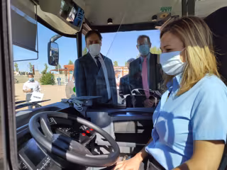 El alcalde de Salamanca junto a una de las conductoras del servicio de transporte urbano de la ciudad. - EUROPA PRESS