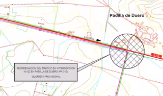 Así, por motivos de seguridad, se realiza una reordenación provisional de la intersección de Padilla de Duero y del camino de acceso a los préstamos mencionados anteriormente mediante la construcción de una glorieta provisional de 18 metros de diámetro en la actual intersección de Padilla de Duero, situada en el kilómetro 312 de la N-122.