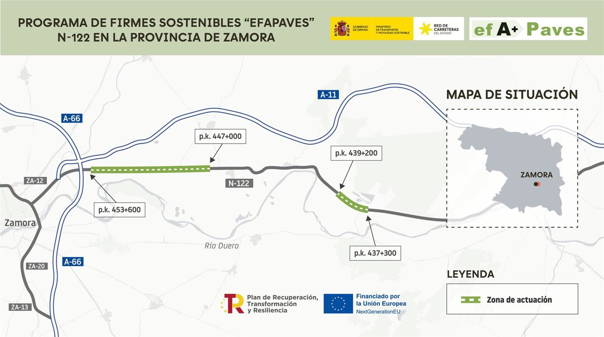 El Ministerio de Transportes y Movilidad Sostenible ha iniciado las obras de rehabilitación del firme de la N-122 con asfalto sostenible en varios tramos en la provincia de Zamora con una inversión de 2,59 millones.