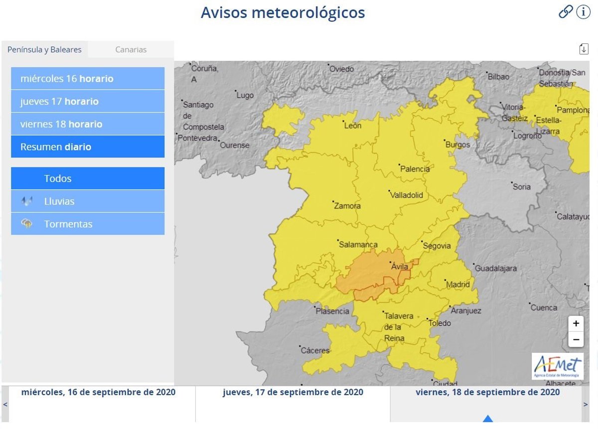 Por otro lado, también se establece nivel amarillo por tormentas en la provincia de Ávila desde las 18.00 horas y hasta las 0.00 horas del día 18.