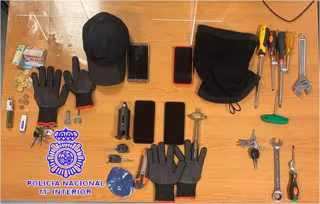 Entre los objetos intervenidos figuran cuatro teléfonos móviles, plástico duro azul, dos pares de guantes de jardinería, un cúter negro y naranja, un extractor de bombines, herramienta de cerrajería de astilla cilindros multiusos, una llave fija de carraca compatible con extractor de bombín de la puerta, dos llaves inglesas, cuatro destornilladores planos, un destornillador torx, una gorra negra...etc.