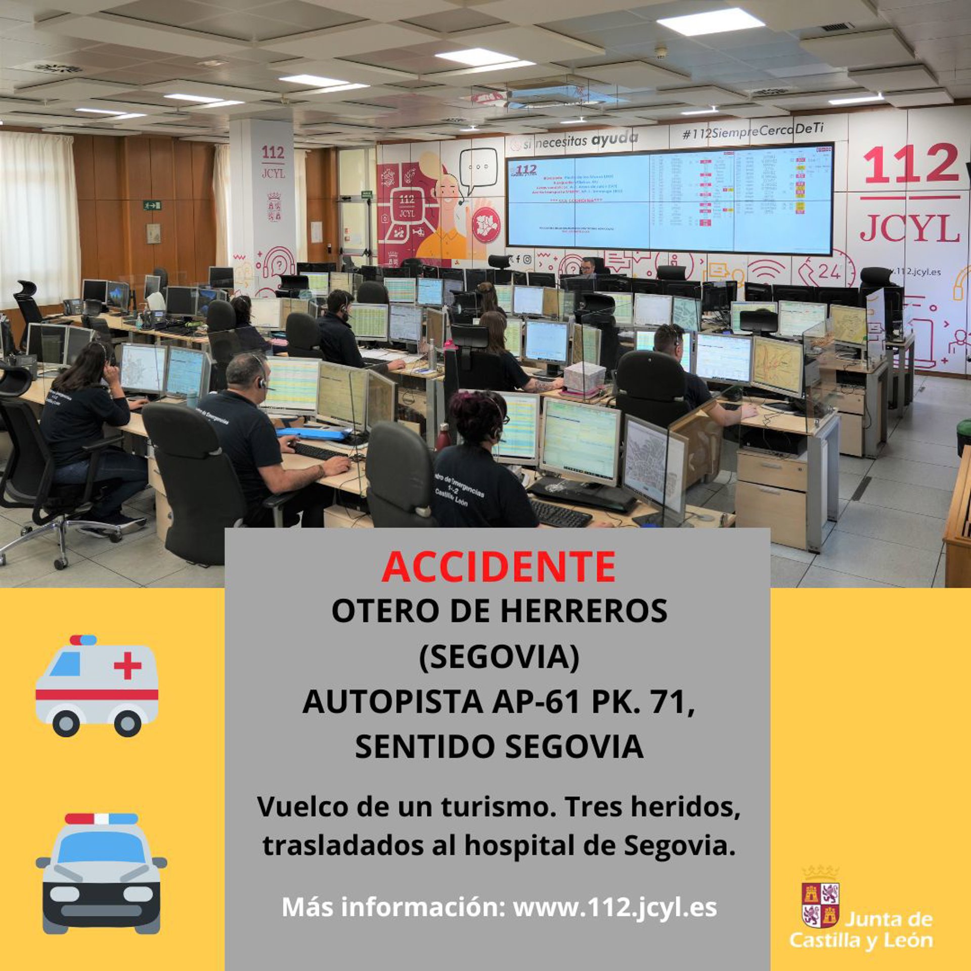 Tres personas han resultado heridas tras el vuelco de un turismo en la autopista AP-61 en Otero de Herreros (Segovia), según datos del 112 Castilla y León recogidos por Europa Press.