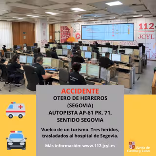 El suceso ha tenido lugar minutos antes de las 14.21 horas de este domingo, cuando la sala de operaciones del 112 Castilla y León ha recibido varias llamadas que alertaban del vuelco de un turismo ocurrido en el kilómetro 71 de la autopista, sentido Segovia, cuyos tres ocupantes, que habían conseguido abandonar el vehículo, se encontraban heridos.