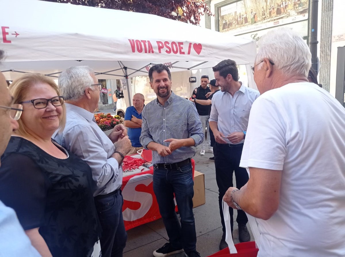 El secretario general del PSOE de Castilla y León, Luis Tudanca, en una carpa del PSOE en la plaza de Sagasta (Zamora). - EUROPA PRESS