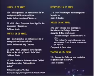 A través de la unidad de Cultura Científica del Vicerrectorado se ha programado una serie de actividades con el objetivo de abrir las puertas a la investigación y dar a conocer los trabajos de esta área que se realizan en la universidad, ha informado la UCAV.