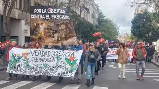 Los manifestantes han llevado banderas de UGT y de CCOO y paraguas y han portado pancartas reivindicativas por la reducción de jornada para docentes mayores de 55 años, por la libertad y contra el fascismo y en petición de verdad, justicia y reparación.