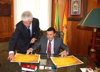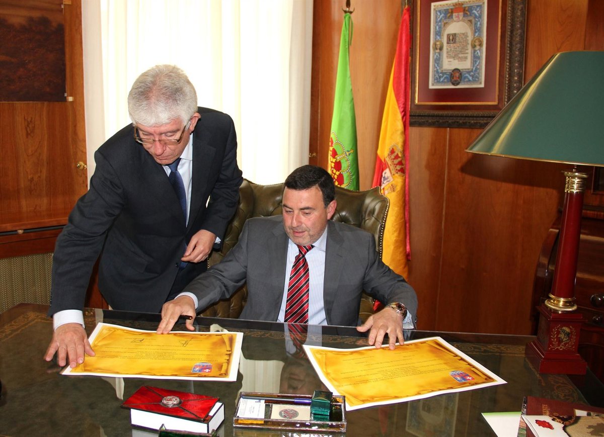 El alcalde y el rector estamparon sus firmas en el documento que acredita el mutuo compromiso. Además, Busto hizo entrega al rector de un cuidado ejemplar de una publicación de fotografías históricas de la villa.